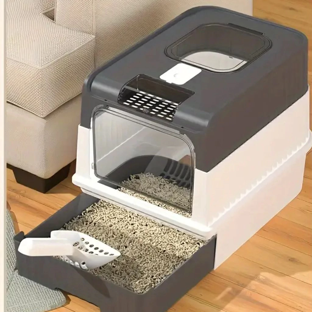Caixa de Areia para Gato ClickLock PetsPam foi pensada para simplificar a limpeza e manter a casa sem rastros. O design fechado com porta frontal fumê oferece privacidade e ajuda a conter odores e respingos. A gaveta deslizante permite retirar os resíduos e repor a areia em segundos, sem desmontar tudo. No topo, a grade anti-rastro reduz a areia nas patinhas na saída. As peças se encaixam com travas laterais (click-lock), são leves, fáceis de lavar e mais higiênicas. Acompanha pá coletora acoplável na lateral. Ideal para quem quer praticidade, limpeza e conforto para o gato.